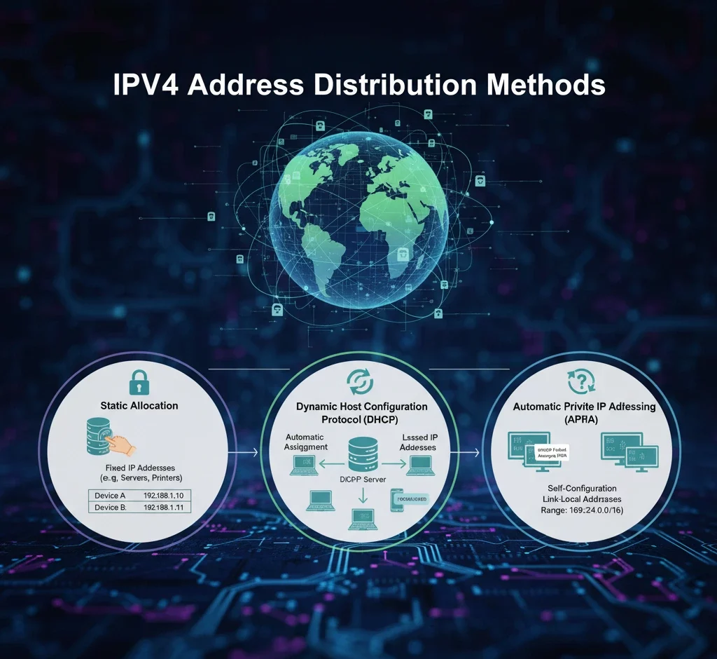 IP address allocation begins with global coordination, where large blocks of addresses are managed by a top-level authority and passed down through regional registries to local providers. Then within networks, addresses are assigned via fixed/static methods or dynamically (for example via DHCP). Networks must also divide up addresses logically (subnets), decide between public vs private space, plan for usage (IoT, mobile, enterprise, cloud), and consider transition from IPv4 to IPv6.