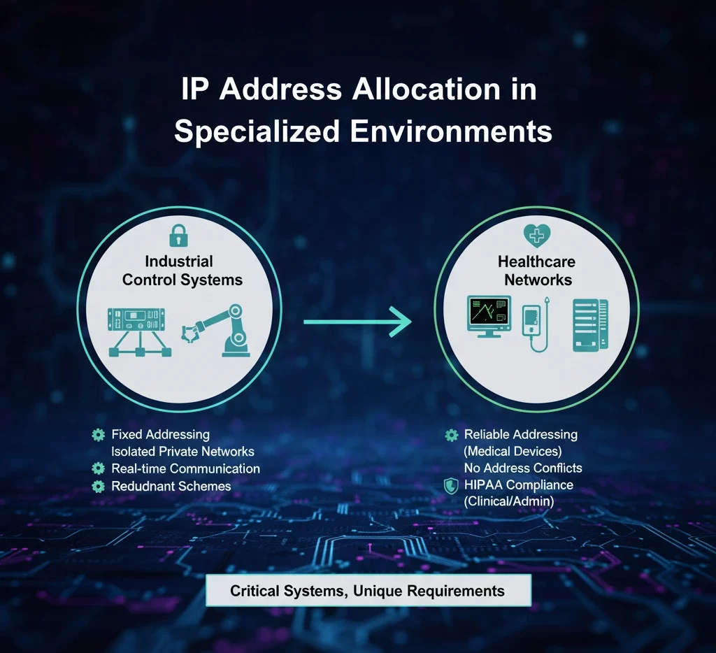 Healthcare networks present distinct allocation challenges. Medical devices require reliable addressing for continuous operation. Patient monitoring systems cannot tolerate address conflicts. HIPAA regulations influence address management practices. Separate networks often handle clinical systems and administrative functions. Downtime can have life-threatening consequences in these environments.