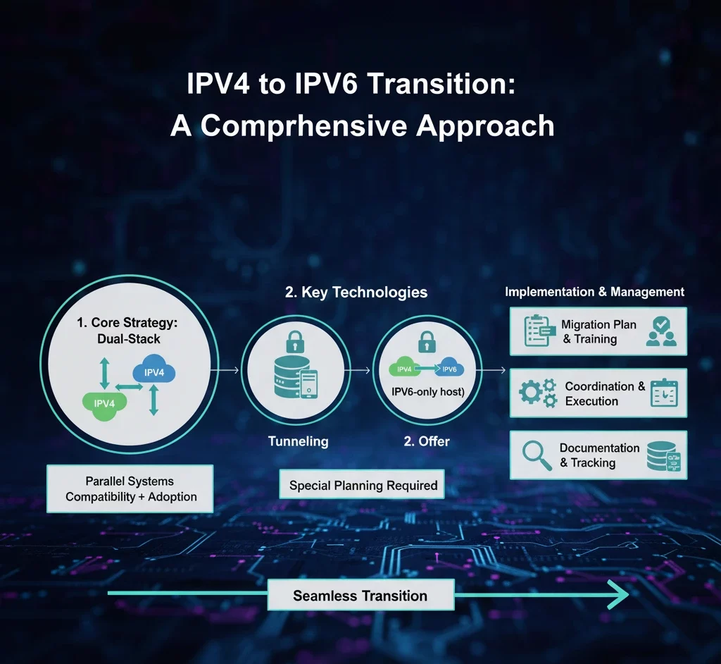 Tunneling and translation technologies need special planning. Organizations should develop detailed migration plans. Staff training ensures proper management during transition. The process requires careful coordination across teams. Documentation should track all address assignments during migration.